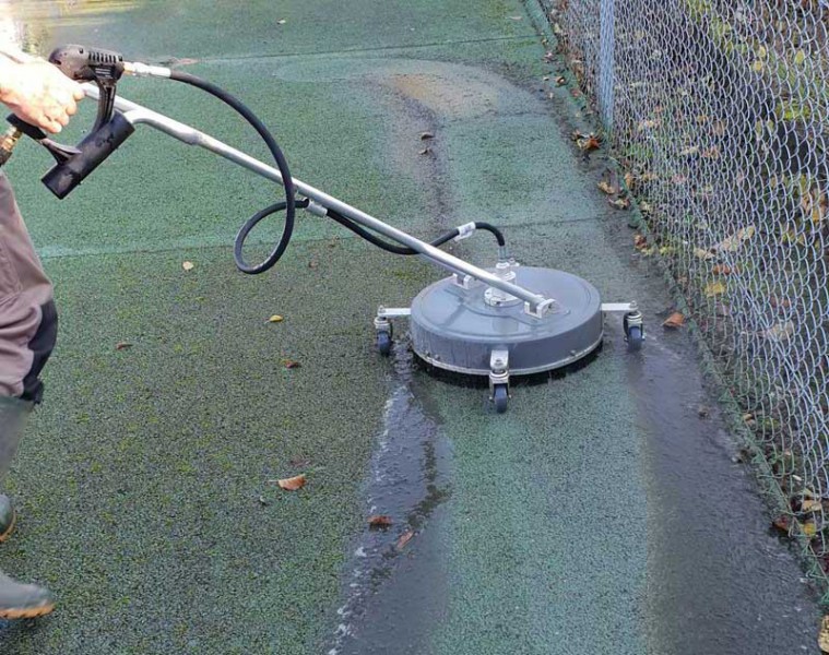 Het feitelijke schoonspuiten wordt met de Rotor Jet gedaan. Dit is een bodemreinigingswagen met een werkbreedte van 50 cm en een werkdruk tot 200 bar. Onder de kap bevindt zich een spuitkop, bestaande uit twee nozzles, die met een hoog toerental in de rondte draait. Met een grote kracht wordt het vuil uit de poriën gespoten. Alle poriën in het oppervlak van de hardcourt baan worden meerdere malen van alle kanten geraakt. Dit heeft een betere diepte qua reiniging tot gevolg.